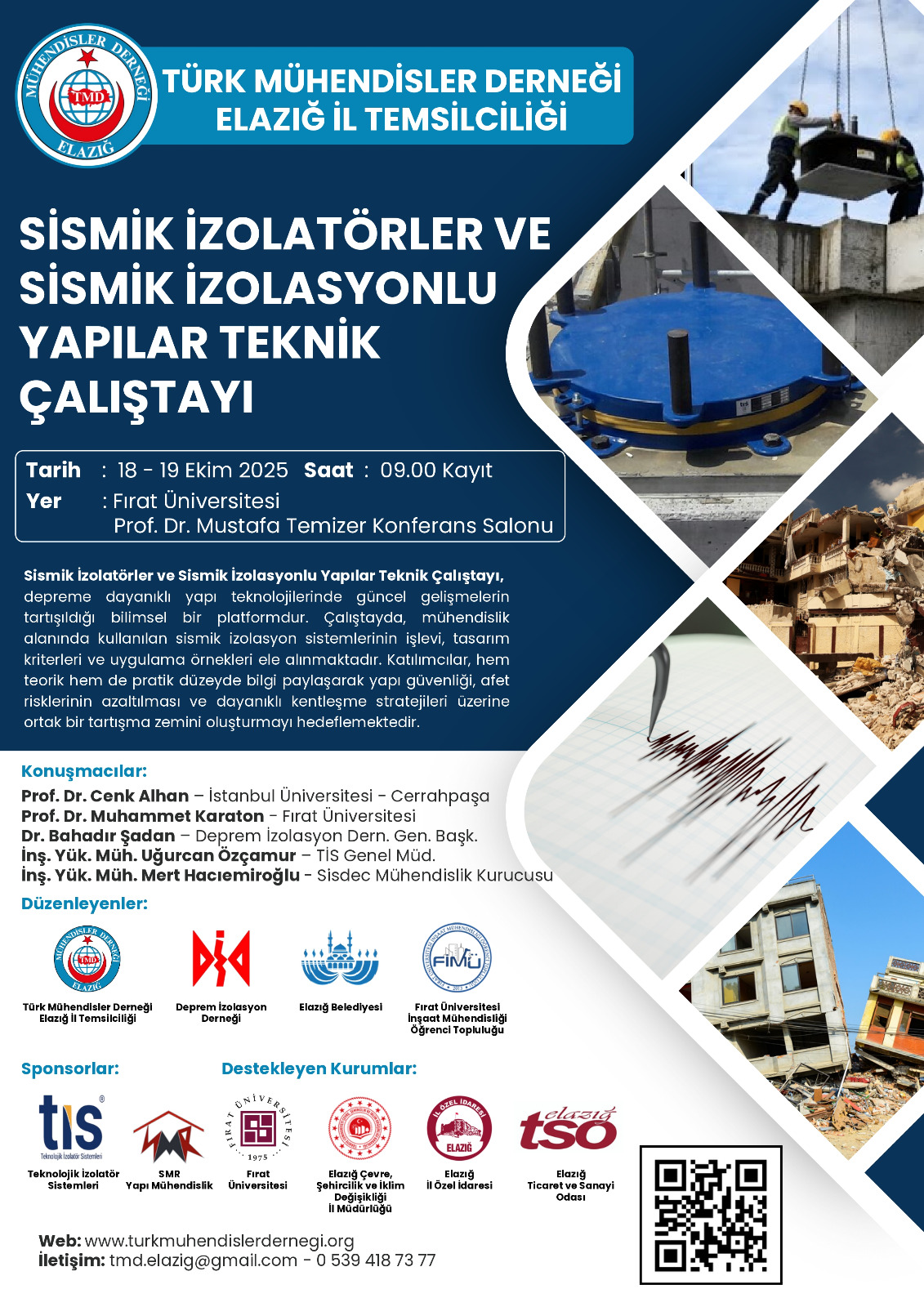 Türk Mühendisler Derneği (TMD) Elazığ İl Temsilciliği ev sahipliğinde Deprem İzolasyon Derneği (DİD), Elazığ Belediyesi ve FÜ’si İnşaat Mühendisliği Öğrenci Topluluğu (FİMÜ) iş birliği ile düzenlenecek olan “Sismik İzolatörler ve Sismik İzolasyonlu Yapılar Teknik Çalıştayı”, deprem güvenliği, yapı teknolojileri ve yerli izolatör üretimi konularında Türkiye’nin önde gelen akademisyenleri ile mühendislerini bir araya getirecek.