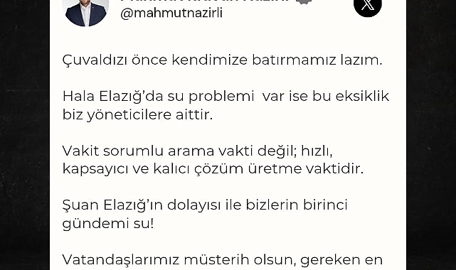 “Çuvaldızı önce kendimize batırmamız lazım. Hala Elazığ’da su problemi var ise bu eksiklik biz yöneticilere aittir. Vakit sorumlu arama vakti değil, hızlı, kapsayıcı ve kalıcı çözüm üretme vaktidir. Şu an Elazığ’ın, dolayısıyla bizlerin birinci gündemi su! Vatandaşlarımız müsterih olsun, gereken en erken zamanda yapılacaktır.”Bu açıklamalar, Elazığ kamuoyunda sorunla ilgili somut adımlar atılacağı yönünde umut yarattı. Nazırlı’nın “önce kendimize eleştiri” vurgusu, çözüm sürecinde şeffaf ve kararlı bir tutum sergileneceğinin sinyalini verdi.Şehrin su sorununa ilişkin kalıcı çözümler için kısa süre içinde somut gelişmelerin yaşanması bekleniyor.