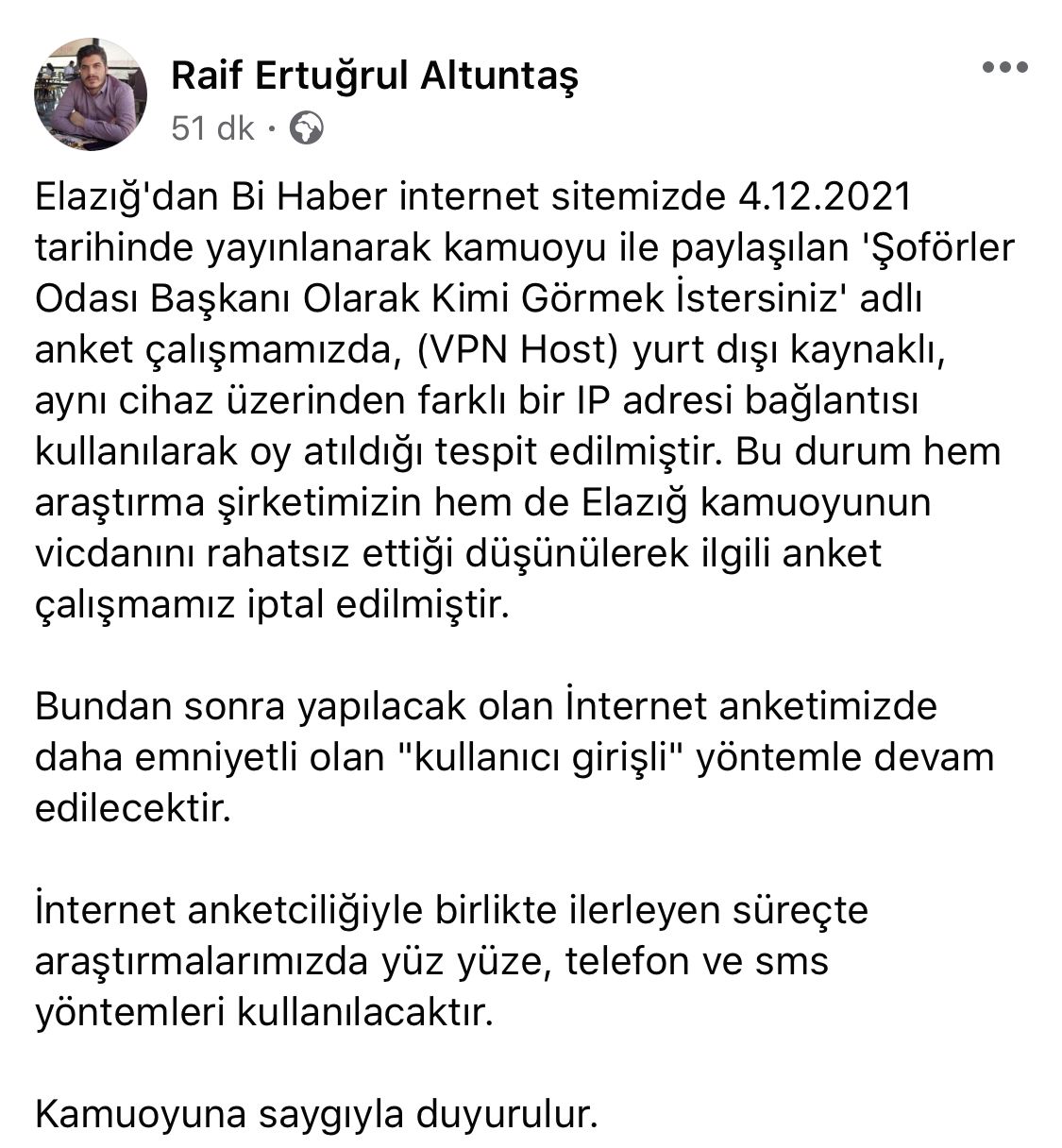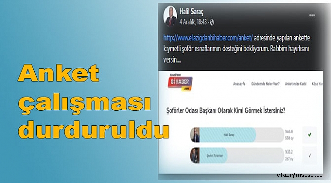 Elazığ Şoförler Odası Başkan Adayı Halil Saraç sosyal medyasından da kamuoyu anket sonuçlarını açıklamıştı.