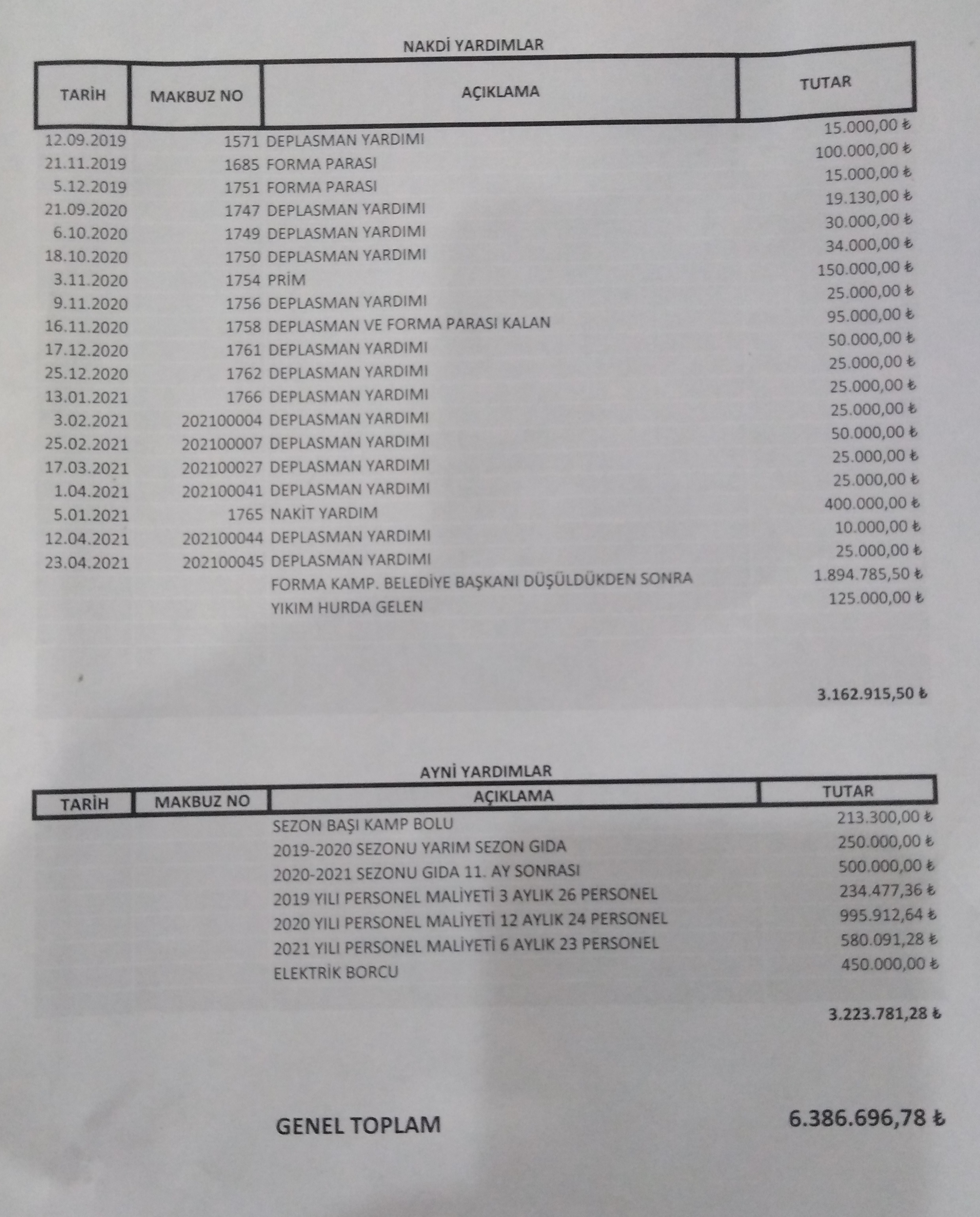Üç, o toplantıda tahtayı kes konuyu kapatalım. Deplasman giderlerini Belediye Başkanı ben karşılayayım. Sana iki buçuk milyon nakit vereceğim biz üç istedik. Sonra toplantı bitti. O dönemde bu tarafa 2,5 milyon verildi. Verilen nakitlere de geleceğim. Oda gelmedi.