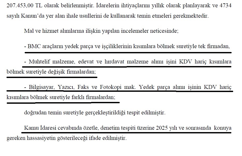 2024 yılı için büyükşehir statüsünde olmayan belediyelerde doğrudan temin limiti 207.453 TL olarak belirlenmiş durumda. Sayıştay, aynı işin farklı tarihlerde ve tutarlarda bölünerek bu limitin altında tutulmasının rekabeti, eşit muameleyi ve kaynakların verimli kullanılmasını engellediğini belirtti.