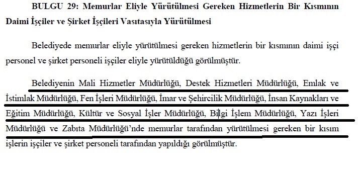 Raporda; Mali Hizmetler, Destek Hizmetleri, Emlak ve İstimlak, Fen İşleri, İmar ve Şehircilik, İnsan Kaynakları ve Eğitim, Kültür ve Sosyal İşler, Bilgi İşlem, Yazı İşleri ve Zabıta Müdürlükleri başta olmak üzere birçok birimde, memurlar tarafından yürütülmesi gereken görevlerin işçiler ve şirket personeli tarafından yapıldığı belirtildi.