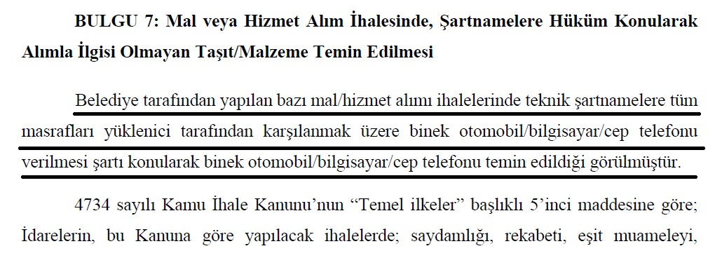 4734 sayılı Kamu İhale Kanunu’nun “Temel İlkeler” maddesinde, idarelerin ihtiyaçlarını uygun şartlarla ve zamanında karşılaması; saydamlık, rekabet ve eşit muamele ilkelerine uyması gerektiği hatırlatıldı. Kanuna göre aralarında doğal bağlantı olmayan mal, hizmet ve yapım işlerinin bir arada ihale edilmesi yasaklanıyor.Sayıştay denetçileri, bazı ihalelerde bu kuralların aşındırıldığını belirtti. İhale konusu işle ilgisi bulunmayan araç, bilgisayar veya telefon gibi ekipmanların şartnamelere eklenerek yüklenicilere temin ettirildiği; bunun da yaklaşık maliyeti artırarak rekabeti olumsuz etkileyebileceği ifade edildi.KAMU İHALE GENEL TEBLİĞİ VE TAŞIT EDİNİM USULLERİNE AYKIRILIK