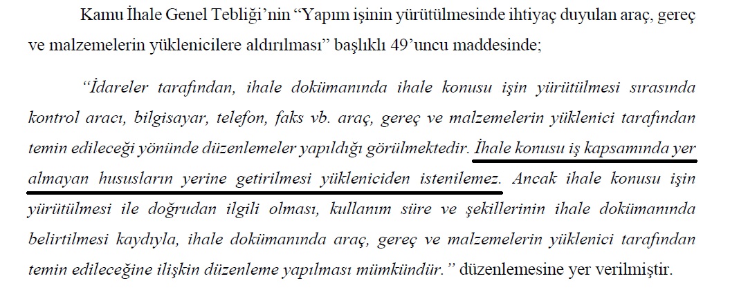 Kamu İhale Genel Tebliği’nin 49. maddesi, yalnızca işin yürütülmesi ile doğrudan ilgili olmak şartıyla yükleniciden araç-gereç istenebileceğini belirtiyor. Ancak denetim sonucunda, bazı mal alımı ihalelerinde kontrol hizmetleri için binek araç ve çeşitli teknolojik ekipmanların istenmesinin bu kriteri karşılamadığı kaydedildi.