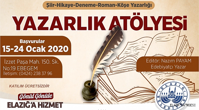 Elazığ Belediyesi tarafından yazınsal yeteneklerini geliştirmek isteyenlere yönelik EBEGEM bünyesinde açılacak Yazarlık Atölyesi için başvuru süresi 24 Ocak Cuma günü sona eriyor.