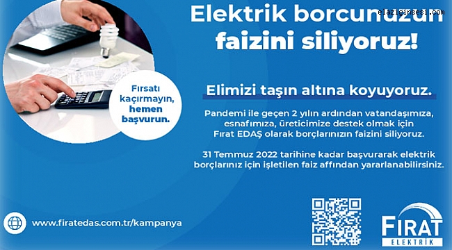 Kampanyadan yararlanmak isteyen tüketiciler, 31 Temmuz 2022 tarihine kadar Fırat EDAŞ İlçe Yöneticilikleri ile İl Müdürlüklerine başvuruda bulunarak faiz affından yararlanabilecek.
