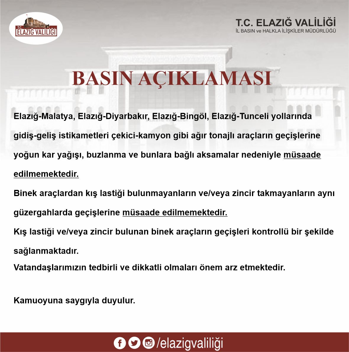 Elazığ Valiliği yoğun kar yağışı nedeniyle ağır tonajlı araçların çevre illere geçişi bir süre buzlanma ve bunlara bağlı aksamalar yaşanmaması ise müsaade edilemediği açıklandı. Elazığ Valiliğinden yapılan açıklamada binek araçların ise kar lastiği ve zincir ile kontrollü bir şekilde geçişlerinin olacağı zincir takmayanların ise geçişlerine müsaade edilmeyeceği bildirildi.