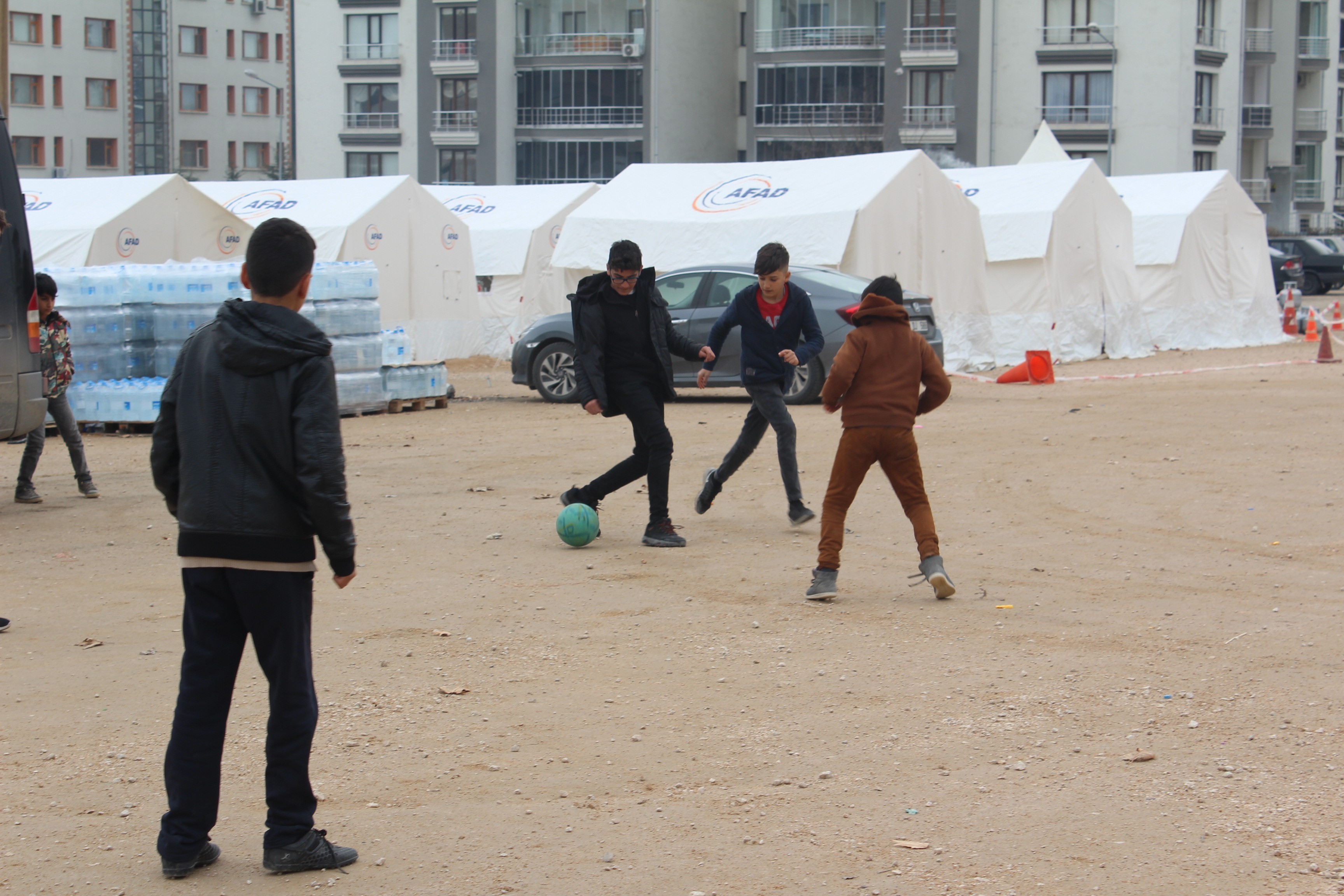 Çadırların arasında futbol oynayan çocuklardan Berkan Kiraz, Can Polat ve Yusuf Alışı evlerinin hasar gördüğü için çadırda yaşadıklarını, vakit geçirmek için ise hep birlikte futbol oynadıklarını aktardı. Çocuklar ayrıca ileride ise iyi bir futbolcu olmanın hayalini kurduklarını dile getirdi.