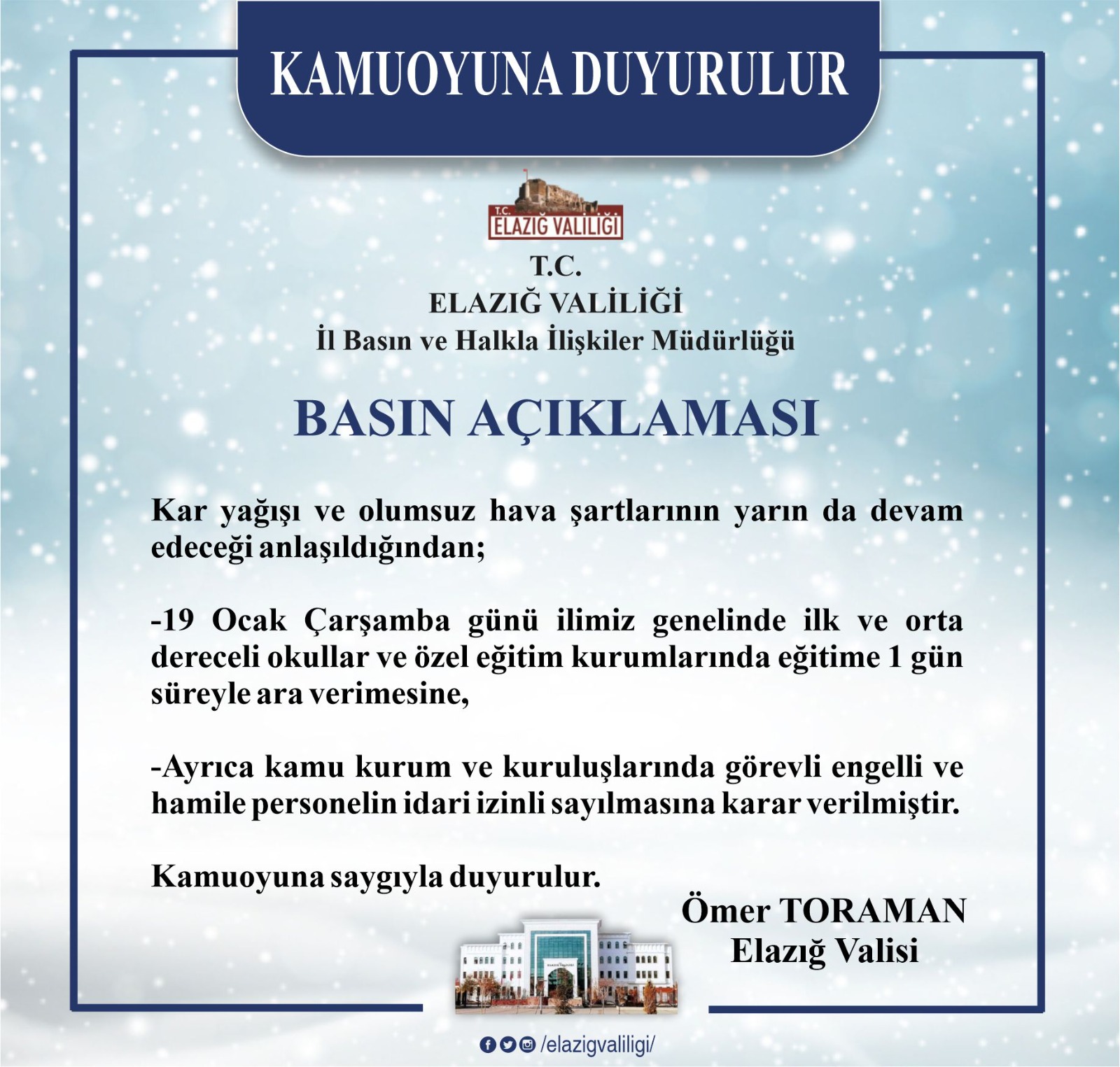 Ülkemizi etkisi altına alan yoğun kar yağışı bir çok ilde eğitime ara verirken İlimizde başlayan kar yağışı nedeniyle bir gün eğitime ara verdirtti. Elazığ Valiliğinden yapılan açıklamada kar yağının Çarşamba günüden etkili olacağı vurgulanarak İlimiz genelinde ilk ve orta dereceli okullar ve özel eğitim kurumlarından eğitime 1 gün süre ile ara verilmesine, ayrıca kamu kurum ve kuruluşlarında görevlis engelli ve hamile personelin idari izinli sayılmasına karar verilmiştir denildi