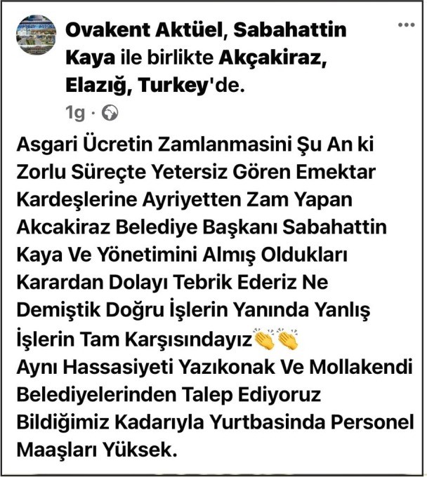 Elazığ Belediyesi çalışan işçilere ek zam yapıp yapmayacağı konusunda yasal dayanak araması devam ededursun gündeme getirdiğimiz bazı belediyeler ile birlikte Akçakiraz Belediyesinin Hak-İş’le masaya oturarak işçilerine ek zam yaptığı ortaya çıktı. Bu haberler sonrasında bizim haberlerimize belediye adına misyon yüklenmeye çalışan ve Üçüncü şahıslara gerek yok diyerek şirin görünmeyi misyon edinen yayın kuruluşuna Akçakiraz belediyesinin haberi kapak olur