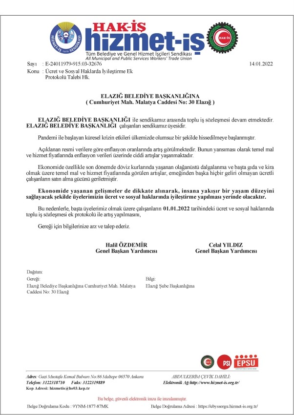 Elazığ Belediye Meclisi Şubat ayı toplantılarının ikinci oturumunda MHP ve İYİ Parti meclis üyeleri belediye işçilerinin maaşlarının enflasyon karşısında eridiğini belirterek yeni bir ek sözleşme ile zam yapılması talebinde bulunmuştu.