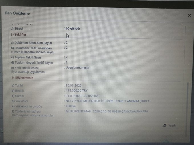 Karar.com haber sitesinde yayınlanan haberde konu ile ilgili olarak şu bilgiler yer aldı. “ Çevre ve Şehircilik Bakanlığı, “Deprem nedeniyle hasar gören, yıkılan binalarda hasar tespit ve enkaz kaldırma çalışmaları esnasında ‘fotoğraf ve video’ çekilmesi” için 18 Mart’ta ihale düzenlendi. İhale kapsamında Elazığ ve Malatya’da 60 gün süreyle fotoğraf ve video çekimi yaptırtılacağı belirtildi. İhaleyi, Tanıtım ve Medyadan Sorumlu AK Parti Ankara İl Başkan Yardımcısı Cemalettin Kömürcü’nün sahibi olduğu Netvizyon Mediapark İletişim Ticaret Anonim Şirketi 415 bin TL teklifle kazandığını ancakKamu İhale Kurumu’na bağlı Elektronik Kamu Alımları Platformu’nda, ihaleye iki şirketin ‘davet edildiği’ sadece Cemalettin Kömürcü’nün şirketi tarafından verilen teklif geçerli sayıldığı açıklandı. 2019 Aralık ayı sonunda Ankara Bilkent’teki 35 bin metrekarelik kamu arazisinin imar planı değişikliğiyle Türkiye Verimlilik Vakfı’na tahsis edildiği ortaya çıktı. Ankara Kent Konseyi Yürütmesi’nde de yer alan ve başkanlığını Cemalettin Kömürcü’nün yürttüğü vakfa yapılan arsa tahsisi yargıya taşındı” ifade edilmişti. Haber gündeme gelmesi ile yoğun tepki çekmişti. Haberin gündeme gelmesinden sonra ihalenin belgeside yayınlandı. İşte doğrudan teminin belgesi...