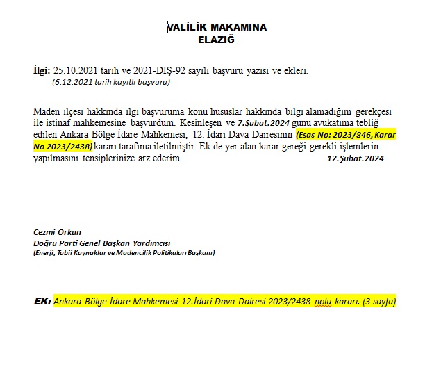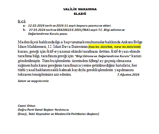 Mahkemenin verdiği karar sonrası Doğru Parti Genel başkan yardımcısı Orkun, 7 ağustos 2024 tarihinde Elazığ Valiliğine ikinci bir dilekçe göndererek yeniden bilgi talebinde bulundu.