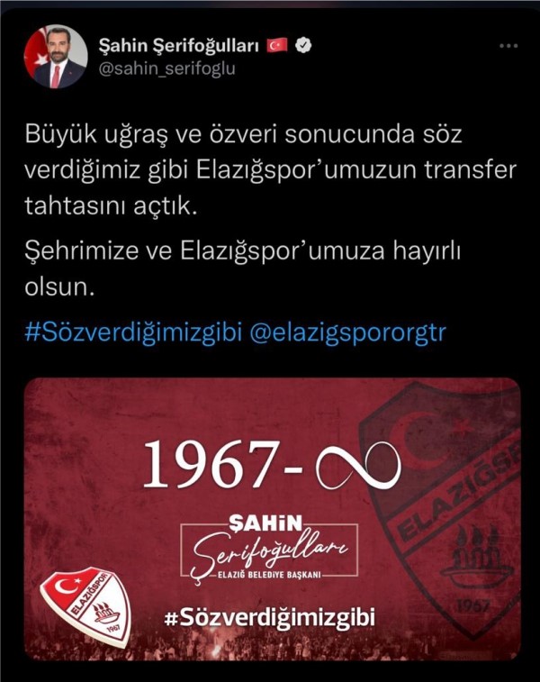 Başkan Şerifoğulları yaptığı duyuruda; “Büyük uğraş ve özveri sonucunda söz verdiğimiz gibi Elazığspor’umuzun transfer tahtasını açtık. Şehrimize ve Elazığspor’umuza hayırlı olsun.” dedi.