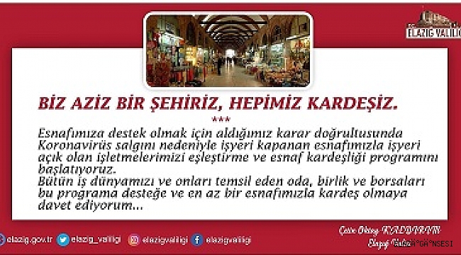 Korona Virüs kapsamında iş yerlerini kapatan esnaflar bankalardan destek kredilerini almakta zorlanırken, Elazığ Valisi Çetin Oktay Kaldırım, Korona virüsü nedeniyle iş yerlerini kapatan esnaf için "Esnaf Kardeşliği" programı başlattıklarını duyurdu. Ülke genelinde olduğu gibi Elazığ'da da korona virüsüne karşı ilk günden itibaren her türlü tedbir alınmaya başlandı. Elazığ Valiliği koordinesinde alınan kararların uygulamaya konulmasıyla kentte birçok yeni tedbir alındı. Yöresel ve doğal ürünlerin bulunduğu 92 yıllık kapalı çarşı ve kent genelinde birçok iş yeri de geçici olarak kapatıldı. Elazığ Valisi Çetin Oktay Kaldırım'da bu konuda bir çalışma yaptıklarını "Esnaf Kardeşliği" programı başlatıklarını duyurdu.