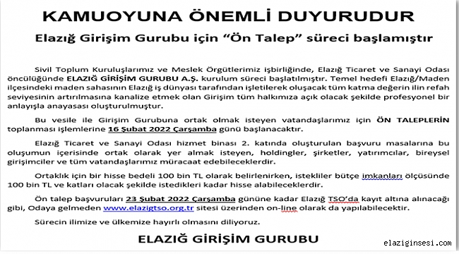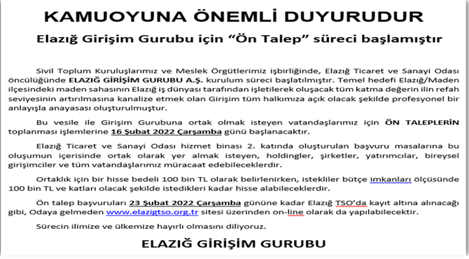 Elazığ Ticaret ve Sanayi Odası Elazığ Girişim A.Ş adı altında ETSO bünyesinde oluşturulan bir çalışma ile halka açık bir ortaklık girişimi başlattığını oluşturulan şirkete yatırım yapmak veya ortak isteyenlerin 23 Şubat'a kadar başvurularının beklendiği açıklandı