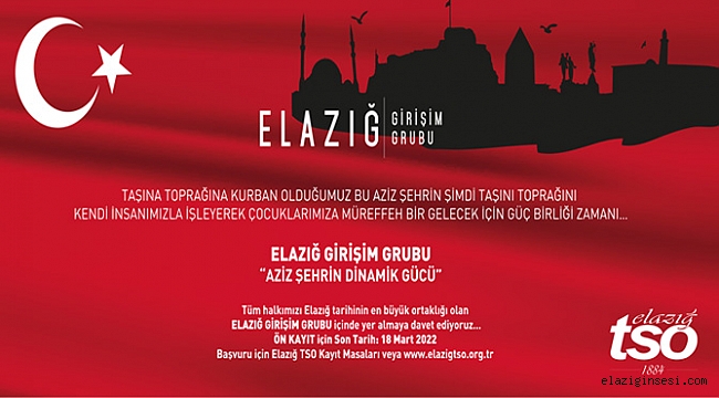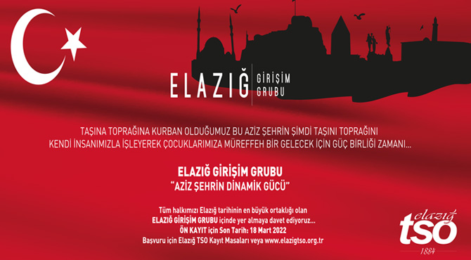 Elazığ Ticaret ve Sanayi Odası, Tüm halkımızı Elazığ tarihinin en büyük ortaklığı olan Elazığ Girişim Grubu içinde yer almaya davet ediyor. Ön Kayıt için olarak son tarih 18 Mart 2022 olarak açıklandı. Ön kayıt yapacak vatandaşların başvuru için Elazığ TSO Kayıt Masaları veya www.elazigtso.org.tr üzerinden kayıt yapabilecekleri açıklandı