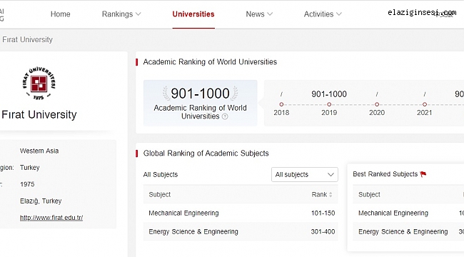 Listeye Türkiye’den 11 üniversite girme başarısını gösterirken; Fırat Üniversitesi Türkiye’de 6 -11. sıra aralığında yer aldı. Sıralama, öğretim elemanlarına ait Nobel Ödülü, bilimsel makale sayısı, yüksek atıf yapılan araştırmacıların sayısı, doğa ve bilim dergilerinde yayımlanan makale sayısı, SCI, SCI-E ve SSCI kapsamında yapılan yayın sayıları göstergelerine göre yapılıyor. Sıralamaya dünya genelinde 1000 üniversite alınıyor.