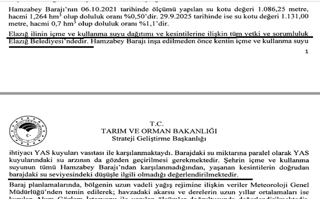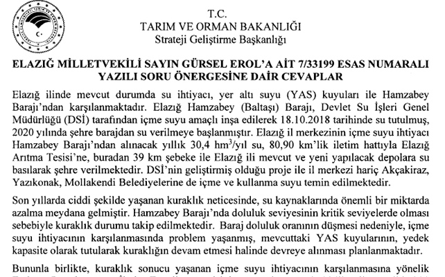 Bakanlık, Erol’un soru önergesinde verdiği yanıtta şöyle; “Elazığ ilinin içme ve kullanma suyu dağıtımı ve kesintilerine ilişkin tüm yetki ve sorumluluk Elazığ Belediyesindedir. Hamzabey Barajı inşa edilmeden önce kentin içme ve kullanma suyu ihtiyacı YAS kuyuları vasıtasıyla karşılanmaktaydı. Barajdaki su miktarına paralel olarak YAS kuyularındaki arızanın da gözden geçirilmesi gerekmektedir. Şehrin içme ve kullanma suyunun tümü Hamzabey Barajı’ndan karşılanmadığından, yaşanan kesintilerin doğrudan barajdaki su seviyesindeki düşüşle ilgili olmadığı değerlendirilmektedir” açıklamasını yaptı