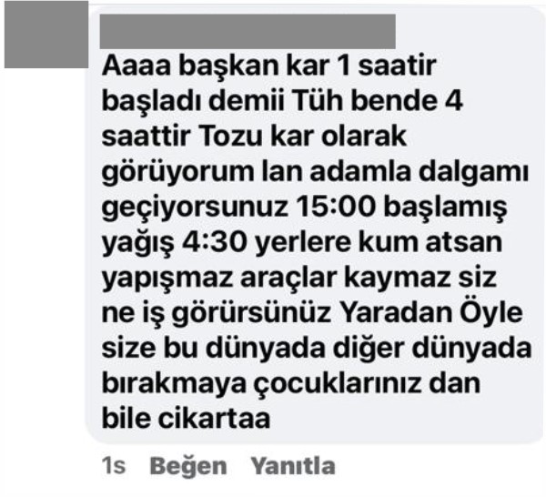 -Aaaa başkan kar 1 saatir başladı demii. Tüh bende 4 saattir Tozu kar olarak görüyorum lan adamla dalgamı geçiyorsunuz 15:00 de başlamış yağış 4:30 yerlere kum atsan yapışmaz araçlar kaymaz siz ne iş görürsünüz Yaradan Öyle size bu dünyada diğer dünyada bırakmaya çocuklarınız dan bile cikartaa.