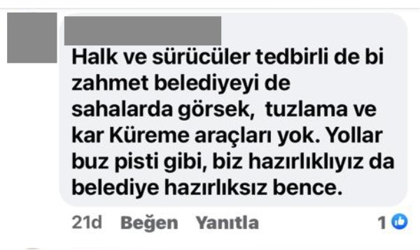 -Halk ve sürücüler tedbirli de bi zahmet belediyeyi de sahalarda görsek, tuzlama ve kar Küreme araçları yok. Yollar buz pisti gibi, biz hazırlıklıyız da belediye hazırlıksız bence.