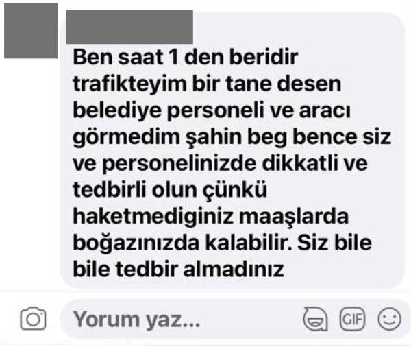 -Ben saat 1 den beridir trafikteyim bir tane desen belediye personeli ve aracı görmedim şahin beg bence siz ve personelinizde dikkatli ve tedbirli olun çünkü haketmediginiz maaşlarda boğazınızda kalabilir. Siz bile bile tedbir almadınız.