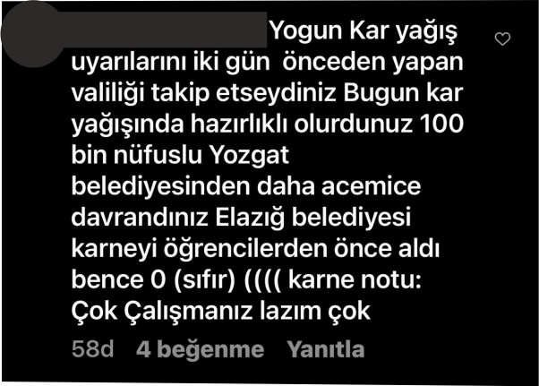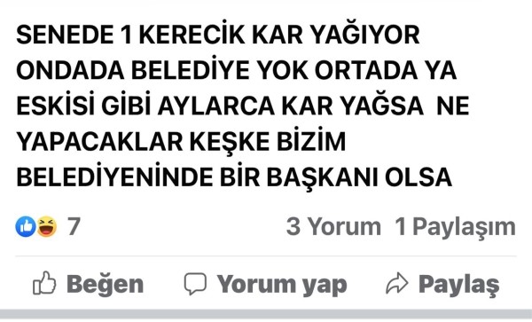 -Senede 1 kerecik kar yağıyor.Ondada belediye ortada yok.Ya eskisi gibi aylarca kar yağsa ne yapacaklar.Keşke bizim belediyeninde bir başkanı olsa.