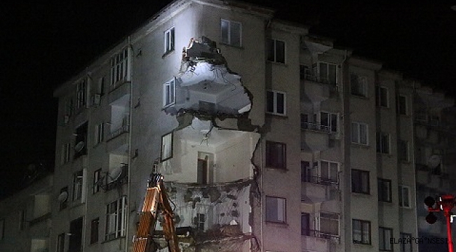 Elazığ'daki 6.8'lik depremin ardından çökme riski bulunan bir binanın dev vinç ve kepçelerle yıkımına başlandı.