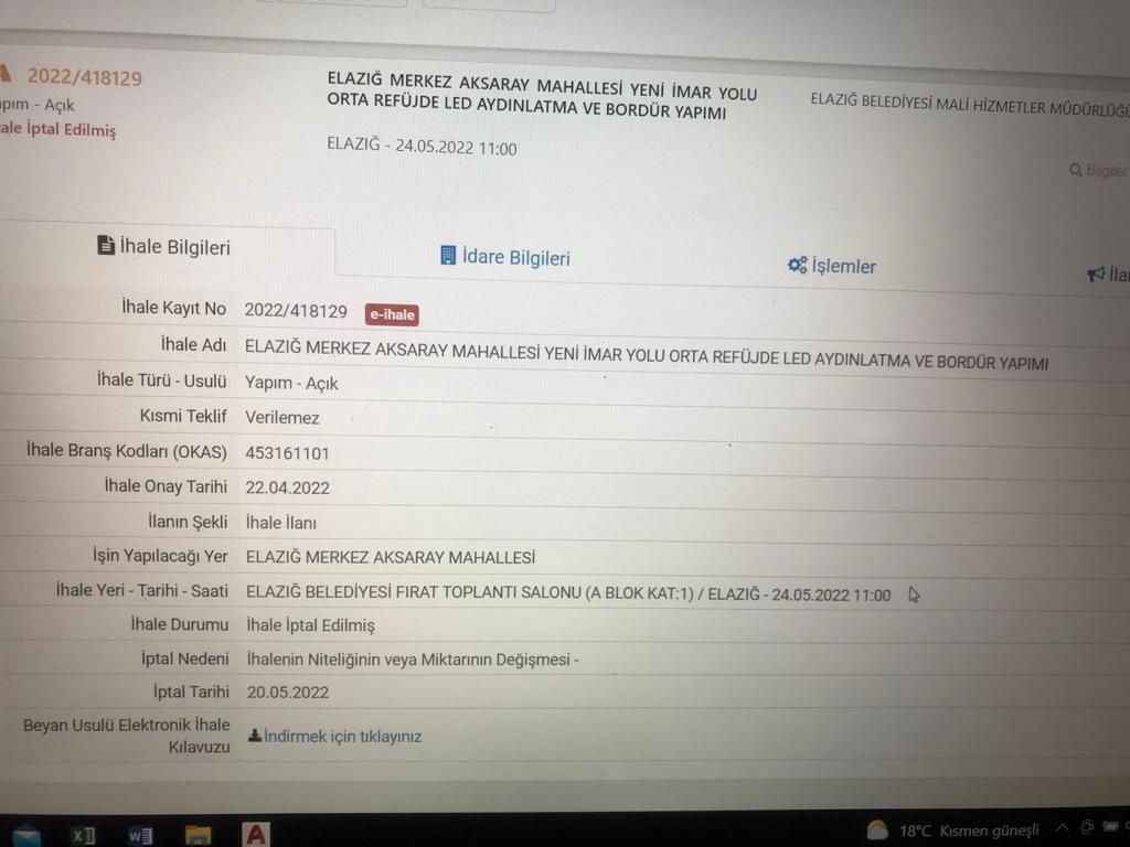 Elazığ Belediyesi tarafından Son olarak 22.4.2022 tarihinde ihaleye çıkarılan Elazığ Merkez Aksaray Mahallesi yeni imar yolu orta refüjde led aydınlatma ve bordur yapım ihalesi iptalinin ”İhalenin Niteliği veya Miktarının değişmesi” gerekçe olarak gösterilmesi kafalarda soru işaretleri oluşturuyor. Daha önce ihaleye çıkarılan ve sonra iptali edilen ihale şartnamelerinde yandaşa göre değiştiriliyor peşkeş iddialarını da güçlendirmeye başladı.