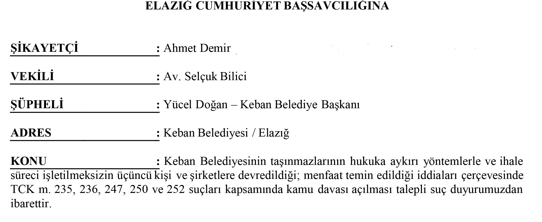 Dilekçede, Gümüşdoğa A.Ş. ve şirket sahibi Mustafa Gümüşel ile ihaleden aylar önce yapılan görüşmelerde, taşınmaz devri karşılığında yaklaşık 30 milyon TL tutarında menfaat sağlandığı öne sürüldü. İhale sürecinde başka firmaların da katılım sağlaması üzerine ihalenin iptal edildiği, ardından taşınmazların ihalesiz şekilde şirkete devredildiği iddia edildi.Bu süreçte banka hesap hareketlerinin ve MASAK kayıtlarının incelenmesi halinde maddi gerçeğin ortaya çıkacağı belirtildi.DEĞİRMENBAŞI MAHALLESİ VE DİĞER TAŞINMAZLARSuç duyurusunda ayrıca Keban Değirmenbaşı Mahallesi’nde belediyeye ait bir arsanın, ihale sürecine aykırı biçimde 17 milyon TL bedelle Öner Tunç isimli kişiye satıldığı; bu satış karşılığında şüpheli veya yakınlarına ait hesaplara 3 milyon TL aktarıldığı iddiasına yer verildi.Bunun yanında, Tektuğ–Çiltuğ Grubu’na ait firmalarla yapılan görüşmeler sonucunda, belediyeye ait bir taşınmazın yaklaşık 100 milyon TL bedelle ihalesiz olarak devredildiği, bu işlemde belediye meclisi kararı ve ihale ilanı bulunmadığı ileri sürüldü.SAVCILIĞA KAMU DAVASI TALEBİBaşvuruda, söz konusu eylemlerin TCK 235 (İhaleye fesat karıştırma), 236 (Edimin ifasına fesat karıştırma), 250 (İrtikap), 252 (Rüşvet) ve 247 (Zimmet) başta olmak üzere çeşitli suçları oluşturduğu ifade edildi.Delil olarak encümen ve belediye meclisi kararları, tapu kayıtları, banka hesap hareketleri, MASAK raporları, EBYS yazışmaları, ihale ilan kayıtları ve tanık beyanları gösterildi.Avukat Selçuk Bilici tarafından yapılan başvuruda, şüpheliler hakkında re’sen soruşturma başlatılması ve kamu davası açılması talep edildi.