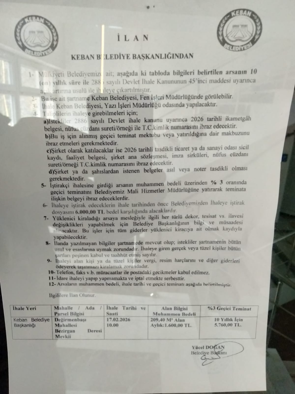 Keban Belediyesi tarafından 17 Şubat 2026 tarihinde Değirmenbaşı Bezirganderesi mevkiinde bulunan 209,40 metrekarelik arsa için aylık 1.600 TL bedel ve yıllık 5.760 TL teminatla ihale açıldı.