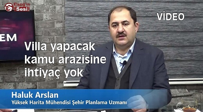 Yüksek Harita Mühendisi Şehir Planlama Uzmanı Haluk Arslan, Elazığ Belediyesinin kamu arazisine ihtiyaç duymadan Villa kent yapması içi yeterli alanların olduğunu söyledi. elaziginsesi.webtv ye konuk olan Arslan, Buralar değerlendirilmeden bir başka yere uydu olarak taşımak hangi mantaliteye hizmet eder diye sordu