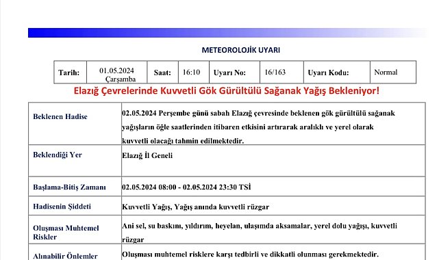 Meteoroloji 13. Bölge Müdürlüğü, Elazığ için gök gürültülü sağanak yağış uyarısı yaptı.Meteoroloji 13. Bölge Müdürlüğü'nden yapılan açıklamada, "02.05.2024 Perşembe günü sabah Elazığ çevresinde beklenen gök gürültülü sağanak yağışların öğle saatlerinden itibaren etkisini artırarak aralıklı ve yerel olarak kuvvetli olacağı tahmin edilmektedir. Ani sel, su baskını, yıldırım, heyelan, ulaşımda aksamalar, yerel dolu yağışı, kuvvetli rüzgar oluşması muhtemel risklere karşı tedbirli ve dikkatli olunması gerekmektedir" denildi.