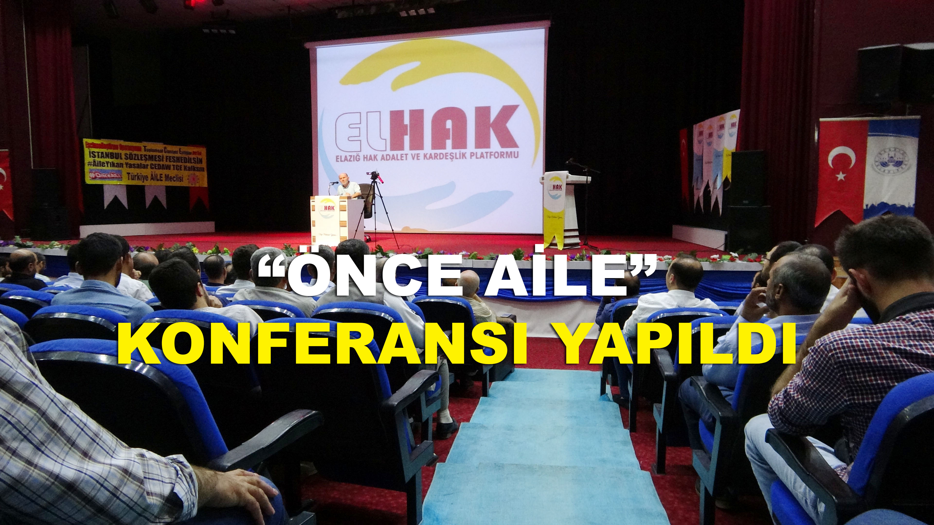 Elazığ’da, ‘Önce Aile’ konferansı düzenlendi. Elazığ Hak Adalet ve Kardeşlik (ELHAK) platformu tarafından ‘Önce Aile’ konulu konferans düzenlendi. Belediye Kültür Merkezi’nde yapılan konferans Kur’an-ı Kerim tilaveti ile başladı. ELHAK Platform Dönem sözcüsü Mehmet Zülfü Öztürk’ün açılış konuşması sonrası Türkiye Aile Meclisi Başkanı Adem Çevik katılımcılara yönelik "Önce Aile" konulu konferans verdi. Aile kavramının önemine vurgu yapılan konferansta, İstanbul sözleşmesinin topluma zarar verdiği ve toplumda tahribata yol açtığı konusuna değinildi.