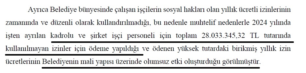 Raporda, sadece 2024 yılı içerisinde işten ayrılan kadrolu ve şirket işçilerine, kullanılmayan yıllık izinler karşılığında 28 milyon 33 bin 345 TL ödeme yapıldığı belirtildi. Bu yüksek tutarın belediyenin mali yapısı üzerinde olumsuz etki oluşturduğu ifade edildi.