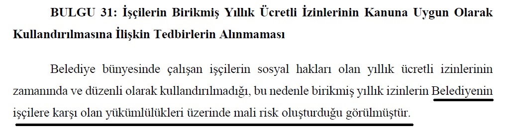 Elazığ Belediyesi ise rapora verdiği yanıtta, tespitler doğrultusunda gerekli işlemlerin yapılması için çalışmalara başlandığını bildirse bile bu güne kadar neden uygulamadığı soru işareti oluştururken, Sayıştay, Elazığ Belediyesi’ne yönelik değerlendirmesinde, yıllık izinlerin mevzuata uygun şekilde kullandırılması, hem çalışan haklarının korunması hem de belediyenin ileride karşılaşabileceği yüksek mali yüklerin önlenmesi açısından zorunlu olduğunun altını çizdi