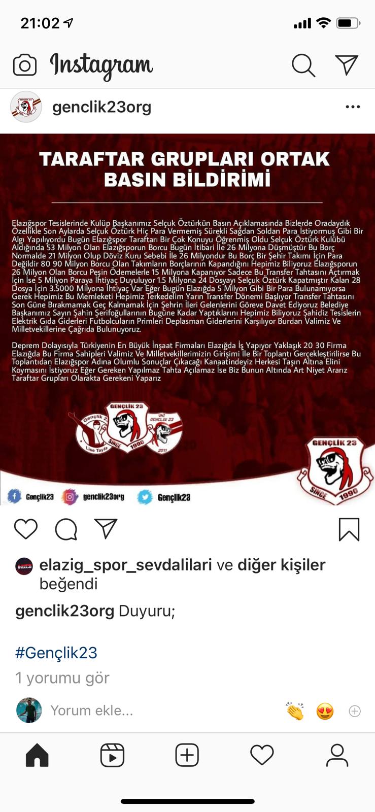TY Elazığspor Başkanı Selçuk Öztürk kulüp binasında taraftar gruplarının da katıldığı bir basın toplantısı düzenledi. Toplantıda borçlar, takımın son durumu hakkında açıklama yapan Öztürk, ara transfer dönemine girildiğini bu dönemin iyi değerlendirmek için Vali ve Milletvekillerinden vaat edilen desteklerin sağlanması istedi. Öztürk açıklamasında geç kalınmaması uyarısında bulunmuştu. TY Elazığspor Başkanı Selçuk Öztürk’ün bu açıklamasından sonra Gençlik 23 taraftar grubu sosyal medya hesabından tüm taraftar grupları adına ortak bir açıklama yaparak Valimiz ve Milletvekillerimizin girişimi ile bir toplantı gerçekleştirilmesinin Elazığspor adına olumlu sonuçlar çıkacağı kanatinde oldukları vurgulanarak “Herkesi taşın altına elinin koymasını istiyoruz. Eğer gereken yapılmaz, tahta açılmaz ise biz bunun altında art niyet ararız. Taraftar grupları olarak gereğini yaparız” Denildi