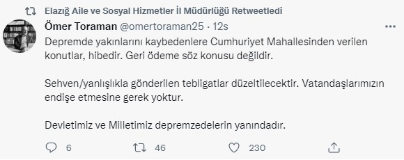 Depremzedelerin tepkisini çeken bu ihtarnamenin yanlış gönderildiği açıklandı. Elazığ Valisi Dr. Ömer Toraman twitter hesabından yaptığı açıklamada “ Depremde yakınlarını kaybedenlere Cumhuriyet Mahallesinde verilen konutlar, hibedir. Geri ödeme söz konusu değildir. Sehven/yanlışlıkla gönderilen tebligatlar düzeltilecektir. Vatandaşlarımız endişe etmesin. Devletimiz ve Milletimiz depremzedelerin yanındadır” şeklinde açıklama yaptı