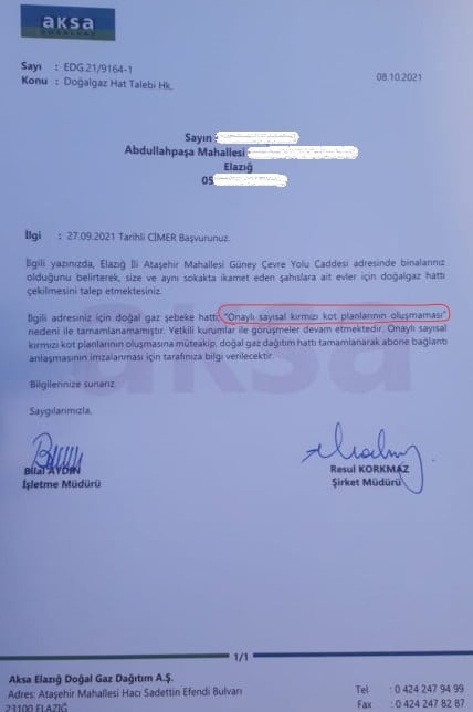 “Elazığ depremin nedeniyle, mağdur olan hak sahiplerine, 17 Şubat 2020 ve 27 Şubat 2020 tarihinde yapılan kura çekilişi yapılmış ve konutlar sözleşme imzalanmadan hak sahiplerine teslim edilmiştir. Elazığ Cumhuriyet Mahallesi Kentsel Dönüşüm Projesi kapsamında 1-A blok 10 nolu konutta hak sahibi olduğunuz ve ikamet ettiğiniz, ancak tüm sözlü uyarılara rağmen 01 Mart 2021 tarihinden bugüne kadar sözleşme imzalamadığınız tespit edilmiştir.