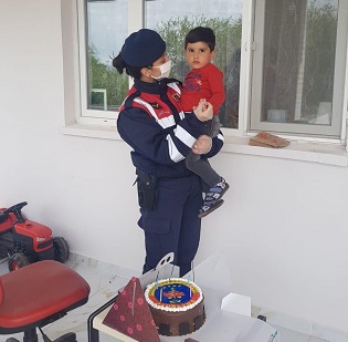 Ülke genelinde olduğu gibi Elazığ'da da Korona virüs tedbirleri kapsamında valilik koordinesinde Vefa Sosyal Destek Grubu, evden çıkmaları kısıtlanan 65 yaş ve üstü ile kronik rahatsızlıkları bulunanlara yönelik her türlü talebi yerine getiriyor. Her türlü desteği sağlayan grupta yer alan jandarmadan polise, sosyal hizmetlerden, belediyeye kadar bir çok kurumda görevli personel sosyal talepleri de yerine getirmek için elinden geleni yapıyor. Bu kapsamda Konya'dan, Elazığ İl Jandarma Komutanlığı'nı arayan bir babaanne, 3 yaşındaki torunu Ahmet Toprak'ın doğun günü için gelmek istediğini ancak salgından dolayı evden çıkamadıklarını belirterek Mehmetçik'ten destek istedi. Bunun üzerine 3 yaşındaki Ahmet için jandarma simgeli bir pasta hazırlatan ekipler, babaannenin talebini yerine getirip merkeze bağlı Acıpayam Köyü'ne götürdü. Köyde ailesi ile yaşayan küçük Ahmet'i ziyaret eden jandarma personeli ninesinin talebi olan pasta sürprizi ile de doğum gününü kutladı.