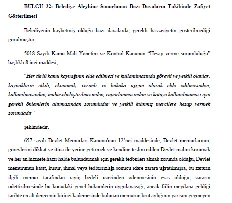 İşte o bulgulardan 32 sırada yer alan Belediyenin bazı davaların takibinde zafiyet göstermesi dikkat çekti.